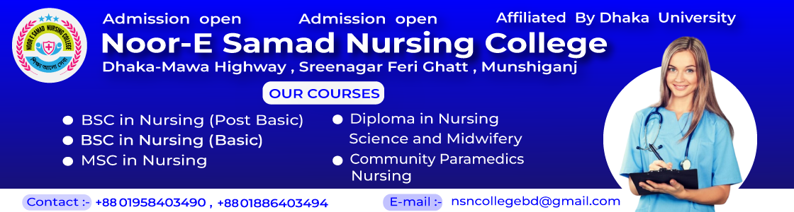 Noor E Samad Nursing college was established in 2020 in Dhaka-Mawa Highway, Sreenagar Ferighatt, Sreenagar, Munshiganj Under the SirajulIslam Welfare Foundation. In 2020 the college became affiliated with the University of Dhaka.it now provides BSc in Nursing Basic and BSc in Nursing post Basic, Diploma in Nursing Science & Midwifery.